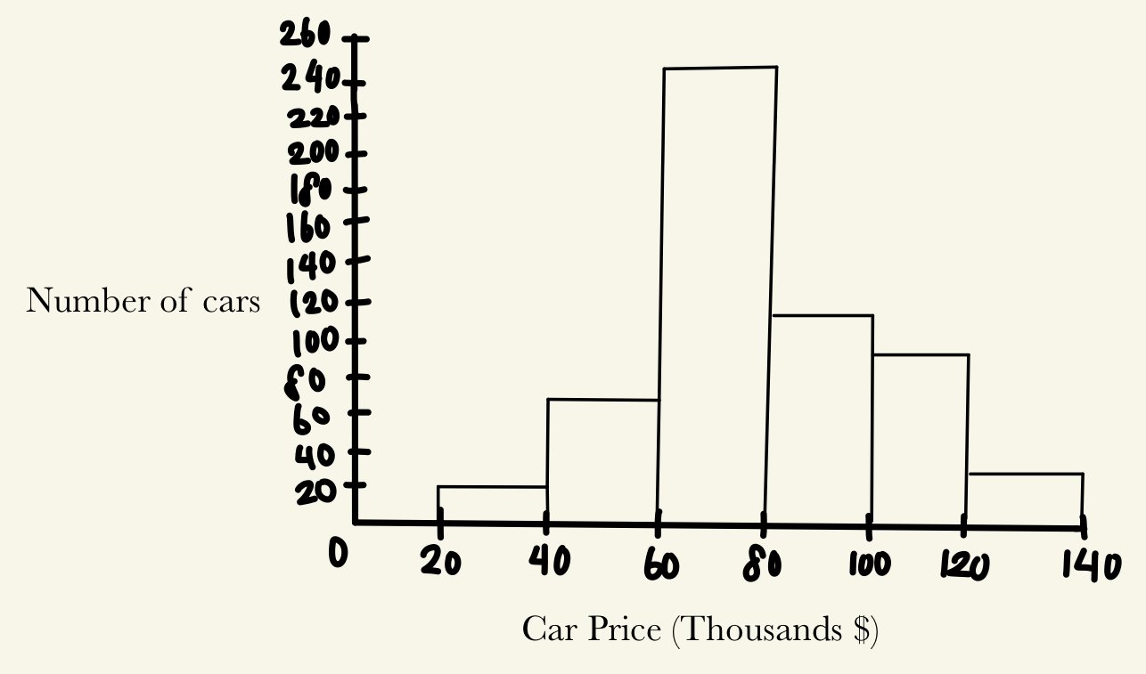 Histograms are often confused with bar graphs, however, there is one crucial difference separating the two: while bar graphs deal with categorical data, histograms deal with continuous data. To illustrate this, assume we have a table of data with the intervals of prices of cars in a dealership:
