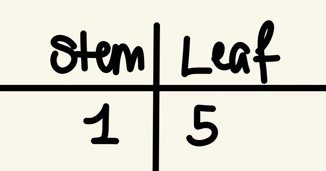 Suppose we have a number 15. In a stem-and-leaf plot, the 15 is split into 1 in the stem section and 5 in the leaf section:
