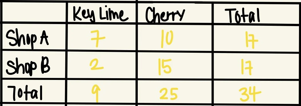 A two-way frequency table depicts the frequencies of two categorical variables, which are variables that can be put into categories instead of having numerical values (ex. hair colour, eye colour, car brand). For example, let’s say we have two stores selling two types of pie: key lime and cherry. A two-way table displaying the numbers of each they sell in an hour is as follows:
